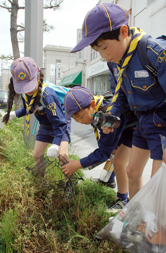 カブスカウト、ボーイスカウトら約20人が参加。南北のロータリーを掃除し、大石神社まで約1・4キロを歩きながら駅前通りとお城通りのごみを拾った。加里屋川沿いなど周辺の路地でも活動した。