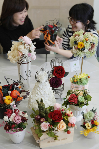 プリザーブドフラワーは脱水、脱色した切花に保存液を染み込ませ、染料で着色して乾燥させたもの。みずみずしい風合いと鮮色を長期間保つことができる。