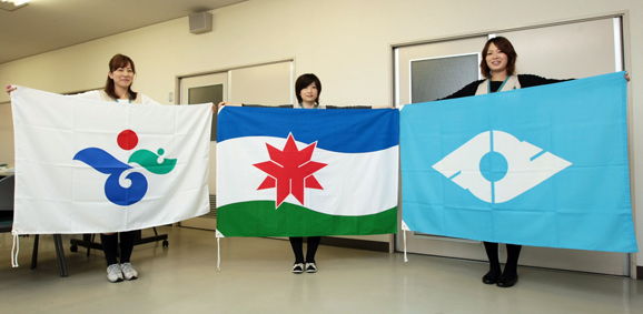 右から上郡町、赤穂市、備前市の自治体旗。一番上に揚がるのはどの旗か