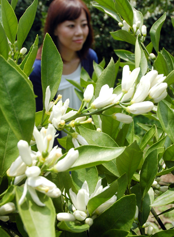 5品種計500本を栽培する「ひろむらみかん園」では早生種から順に長さ約3センチのつぼみが付いた。17日ごろから開花が始まり、かれんな白色5弁が緑葉に映えている。