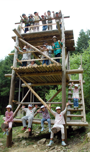 展望やぐらは「子どもたちがより里山に親しめるように」と平成20年2月から少しずつ組み立てた。四隅の主柱には長さ8メートルを越す直径約30センチの部材を使用。階段と手すりを取り付け、子どもにも安全な構造にした。
