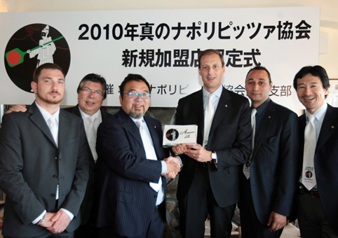 この日の総会で新たに6店舗が認定され、加盟店は36店に。「日本でナポリピッツァが広まっているのは西川さんのおかげ」とマッシモ・ディ・ポルツィオ会長代行からプレートを手渡された西川さんは「これからも質の高い認定店が増えるように努力したい」とあいさつした。