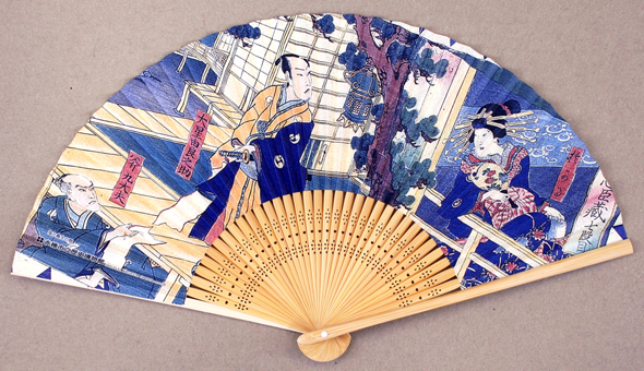 幕末から明治に活躍した浮世絵師、豊原国周の大判錦絵「仮名手本忠臣蔵七段目」=同館所蔵=を意匠に採用。大星由良助、おかる、斧九太夫が登場する「祇園一力茶屋の場」を扇面に、長さ7寸5分の紳士用扇子に仕立てた。