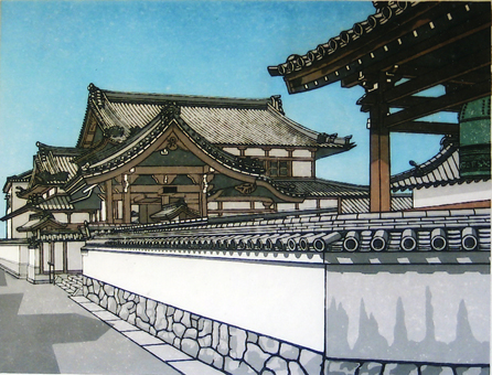 入選作は「以前から絵になる景色と思っていた」という構図。澄んだ空の青さ、光の当たり具合で色が異なる白壁や柱などを8版13色の多色刷りで表現した。