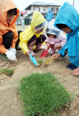 あいにくの雨天にも関わらず、自治会の呼びかけに大人から子どもまで約150人が雨具を持って参加。公園のほぼ西半分約1000平方メートルに前日掘っておいた縦横各50センチ間隔の穴に5センチ角のポット苗を埋め込み、早く根付くように軽く踏み固めた。