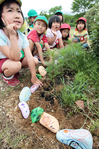 子どもたちは花の成長を願い、「ちちんぷいぷい」とみんなでおまじない。年長組の川上菜々穂ちゃん(5)は「きれいに咲いてね」とひときわ元気な声を響かせていた。