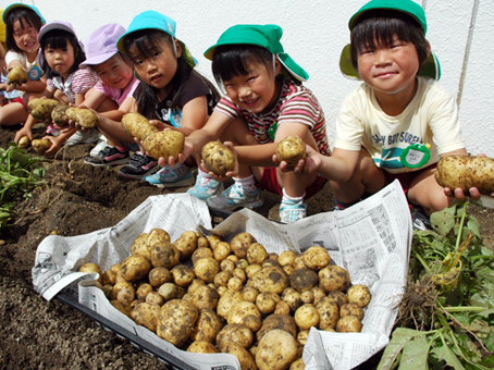 子どもたちは「一緒に掘れて楽しかった」とにっこり。掘ったジャガイモは幼稚園で来週開くカレーパーティーの材料になるほか、保育所の給食の食材としてプレゼントされた。