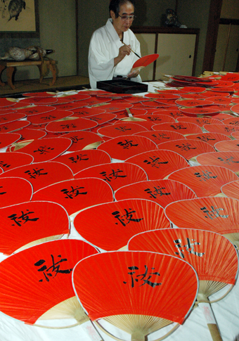 生浪島宮司が一本一本手書きして作る「祓うちわ」
