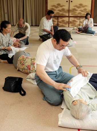 会員9人が訪問。ほどよくエアコンが効いた室内で背中や腰などを丁寧にもみほぐし、入所者に喜ばれた。