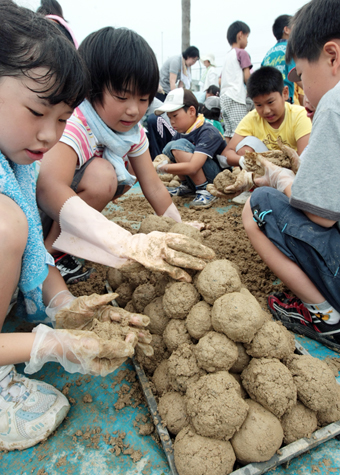 小分けした土の山を車座に囲み、にぎやかに会話しながら作業。ソフトボールぐらいの大きさの団子を次々と生産し、用意された約2トンの土は1時間ほどでなくなった。