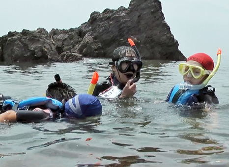 児童らは今学期、潮干狩り、磯観察などの体験活動で地元の海への関心を高めてきた。シュノーケル体験は4年目。今年も自然保護NPO「赤穂海っ子倶楽部」(三島正嗣代表)が子ども用ウエットスーツなど機材を提供した。
