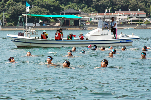 児童らは出発前、浜辺で円陣を組んで「全員で絶対に泳ぎ切るぞ」と気合い。泳力別の4班で順次スタートし、約400メートル先の生島を目指した。