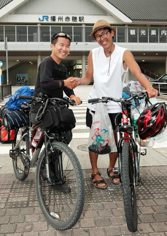 異国の地で偶然出会ったのは、アンサン市のコン・キョンワンさん(26)とソウル市のチャン・インチェさん(22)。ともに大学生で夏休みを利用して来日。愛用のマウンテンバイクに荷物とテントを積み、約1カ月間の予定で野宿旅行中だった。