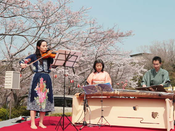 御崎展望台では午前10時から「赤穂御崎さくらまつり」が勇壮な義士太鼓で開幕した。赤穂観光協会の成世邦俊副会長が「すばらしい天気に恵まれた。瀬戸内海国立公園にある5000本のサクラを存分に楽しんで」とあいさつ。琴とバイオリンの生演奏で優雅な時間が流れた。