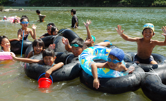 発泡スチロールと板を貼り合わせた手作りいかだは6年生限定のアトラクション。父親らが揺らすいかだの上でスリルを楽しんだり、水へ飛び込んだりして川遊びを満喫した。