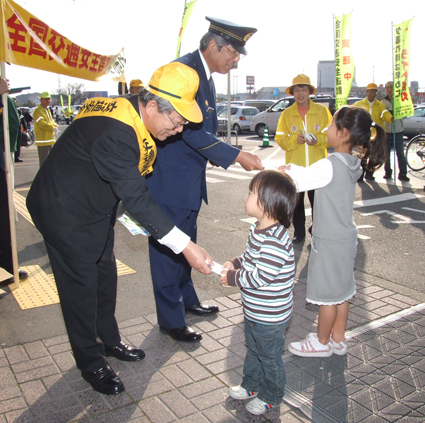 市内スーパーでは夕方、交通安全協会の会員ら約50人が横断幕やのぼりを掲げてアピール。豆田正明・赤穂市長、岡田正則・赤穂署長も参加して啓発チラシ入りのポケットティッシュを買い物客に配った。