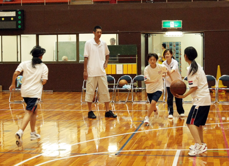 赤穂市バスケットボール協会(霜野章会長)が主催。日本人初のプロ選手で、日本リーグMVPに輝いたこともある外山英明さん(43)を講師に招いた。