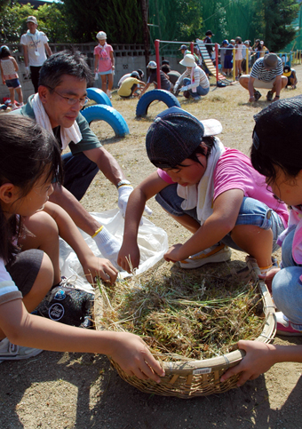 親子ふれあい行事として同校PTA(干飯栄治会長)が呼びかけ。夏休み中に雑草が伸びたグラウンドを大人が機械で刈り、子どもが熊手で集めた。花壇に生えた草は手作業で取り除いた。