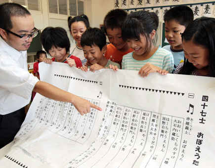長安健太教諭=左端=が作詞作曲した「四十七士おぼえうた」で義士の名前を覚える子どもたち