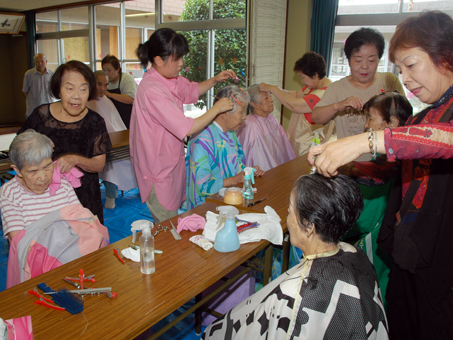 組合加盟の美容師9人が来所。30年以上続くボランティア活動で顔なじみの入所者も。「暑いけど、元気そうで何より」などと話しながらハサミを動かした。