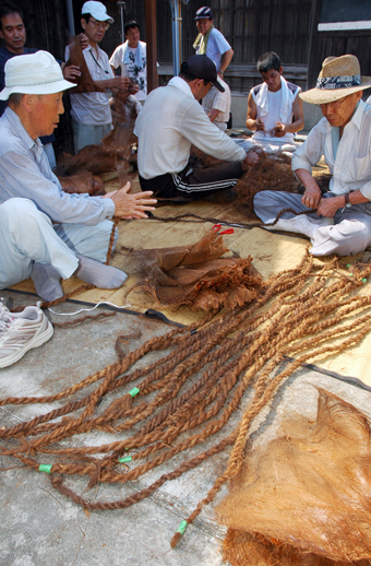 材料に用いるのは地元の八祖山に自生するシュロの樹皮を冬の間に集めて半年以上陰干ししたもの。木槌でたたきほぐした繊維をより合わせ、1・5センチほどの太さに編み込んだ。大人15人ほどで約1時間半作業し、必要な本数が揃った。