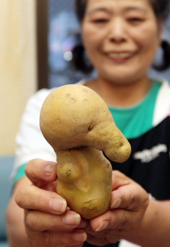 角度によっては鳥のひなのようにも見える。高田さんは「ジャガイモは毎年栽培してきたけど、こんな形は初めて」と話していた。