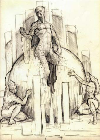 像の題名は「結晶」。人が両横を支える球体から人物が力強く立ち上がる様子を彫刻する。