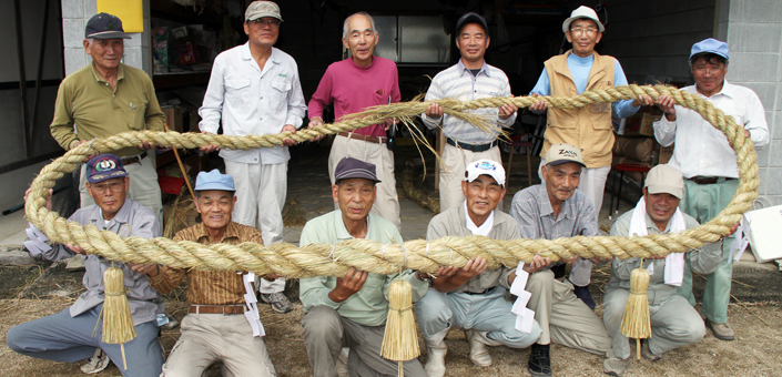 同神社の注連柱に飾るしめ縄は年に一度、秋祭りに合わせて地域住民の手で新調する慣習。3年前に「西有年地区しめ縄保存会」を結成し、伝統継承を図っている。