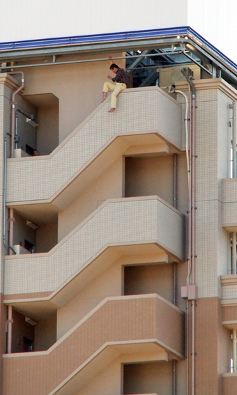 警察が現場へ駆けつけたところ、男性は地上約30メートルの非常階段から身を乗り出し、手すりに腰掛けた状態。自殺をほのめかすような発言を繰り返していたが、署員が説得を重ねて約3時間後に保護した。男性にけがはなかった。