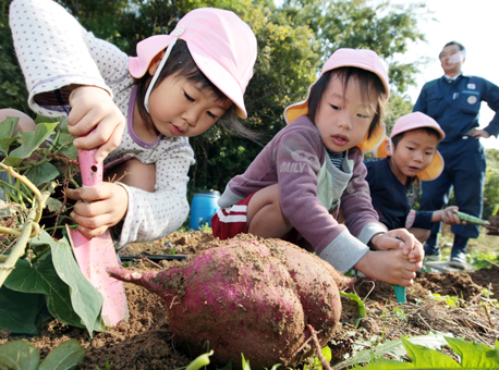 子どもたちが今年6月に植えた鳴門金時。園児らは地中に顔をのぞかせる赤紫色のイモを見つけると、「よいしょ、よいしょ」と移植ごてで土をかき分けた。猛暑で実りが心配されたが、中には重さ5キロ以上の大物を掘り当てた子もあり、周りからうらやましがられていた。
