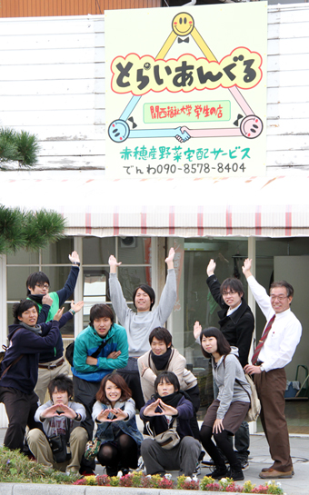 「商学連携による地域活性」などを研究テーマとしている溝端剛ゼミの3、4回生が県と大学の補助金を元手に、ここ1年ほど空き店舗だった平屋建て約8坪を賃貸。「生産者と消費者、学生が手をつなぐ」との意味を込め、店名を「とらいあんぐる」と決めた。授業のない土日限定で午前9時にオープンし、店頭販売しながら宅配注文を受け付け。午後1時に閉店した後、溝端教授が運転する車で配達に回る。宅配料は市内一律300円。2000円以上購入すれば無料になる。