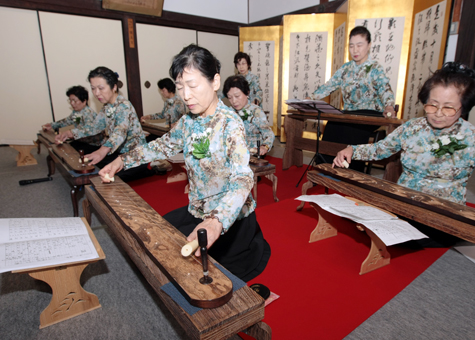 赤穂を訪れたのは、岐阜県大垣市の「ひびき会一絃琴」(大野響苑代表)の8人。大垣藩戸田家と赤穂藩浅野家が姻戚関係にあることから、「赤穂藩主と義士の御霊に捧げたい」と大垣市歴史民俗資料館の長澤均館長を通じて献奏を申し入れた。