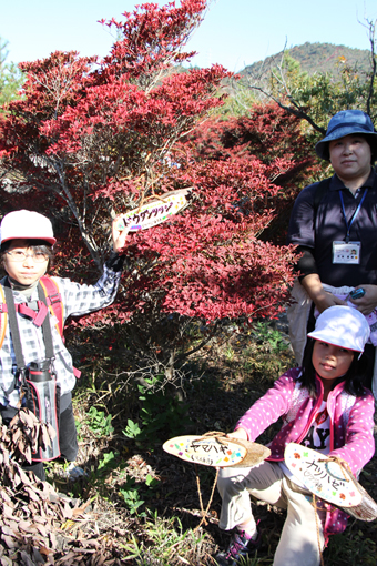 子どもたちは2日前に各自が作成した樹名札を手に登山。塩屋の安藤収二さん(67)ら「ひょうご森のインストラクター」4人の案内で、山道沿いに自生するドウダンツツジ、ウバメガシなど約60種90本にプレートをかけた。