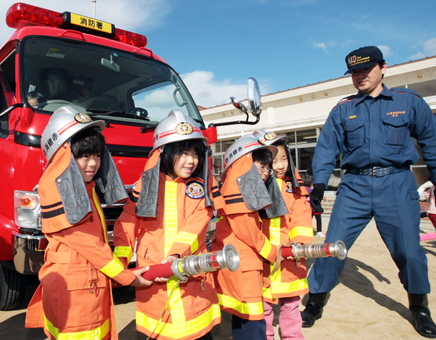 教室は昨年も予定していたが、緊急出動が入りキャンセルに。年長組の中島碧葉ちゃん(6)は「消防車は機械がいっぱいあって、かっこいい」と目を輝かせていた。