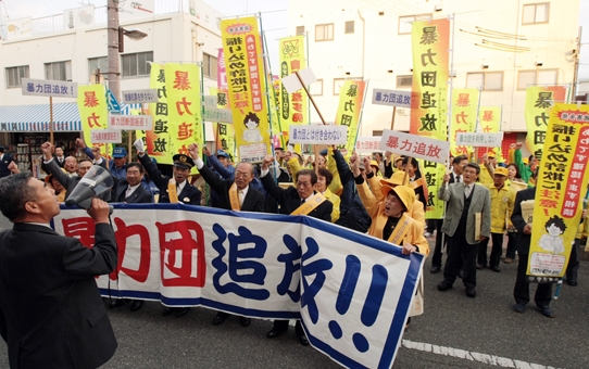パレードは会館から市庁舎まで約1キロ。横断幕やのぼりを掲げた参加者らが隊列を組み、「暴力団は出て行け」などと声を上げて行進した。市庁舎近くの暴力団組事務所前でもシュプレヒコール。「暴力団と関係を断つ会」の藤野高之会長が「解散要求書」を拡声器で読み上げ、事務所の郵便受けに投函した。