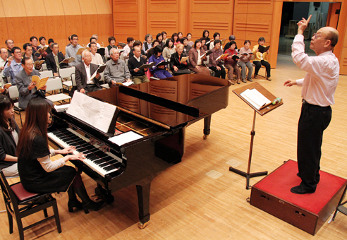 「経験者が初心者を引っ張っている。練習を重ねるごとに声量もアップしてきた」と語るのは、合唱指導の井上敏典さん(51)=しらさぎ音楽学院長=。今月5日には公演当日にタクトを振る延原武春氏(67)=テレマン室内管弦楽団常任指揮者=から直接指導を受けた。