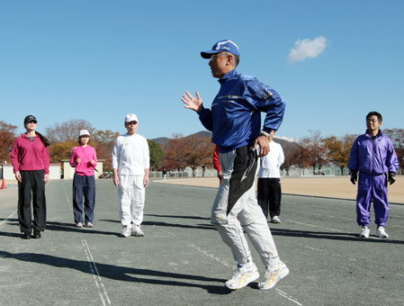 コーチは赤穂高校陸上競技部の西脇泰司監督(46)。ウオーキング、速歩、スキップと徐々に歩幅を広めるトレーニングで足の運びや腕振りなど基本動作を練習した。