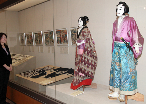特別展では、文楽人形より1・5倍大きいかしらが特徴の淡路浄瑠璃人形、歌舞伎役者の七代目澤村宗十郎が使用した「勘平歌舞伎衣装」など約70点を紹介。「仮名手本忠臣蔵」が生まれる以前に演じられた「碁盤太平記」「忠臣金短冊」など江戸後期の台本から、平成16年に国立文楽劇場で使われた舞台背景デザイン画の「道具帳」まで幅広い年代の品を展示している。