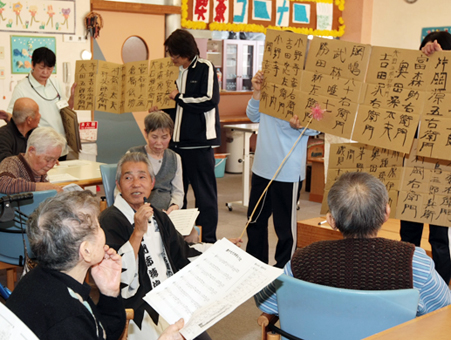 「君の恵にくらぶれば」で始まる「四十七士の歌」、赤穂小で今年9月に出来た「四十七士おぼえうた」などを全員で合唱。カラオケタイムでは利用者が「刃傷松の廊下」を熱唱した。ケアマネージャーの山本俊郎さん(67)は、かつらと衣装で浪曲師に扮し、「南部坂雪の別れ」を披露。忠臣蔵の名場面を語り、会場の涙を誘った。