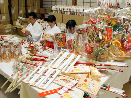 用意する縁起物は宝船、くま手など約70種類あり、総数約2万点。巫女、神職が一点ずつ手に取って品物を点検している。20日から準備に取り掛かり、30日までには整えるという。