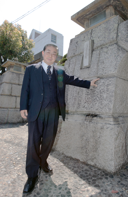 橋本博行・第23代校長。赤穂城跡から移築の旧校舎正門に「思い出深いですね」