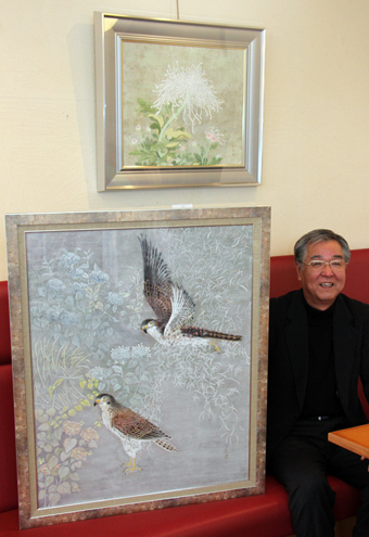 花鳥画「いにしえの森」は橋本さんが幼いころ近所の森や河原でよく見かけたという鷹の一種チョウゲンボウのつがいがモチーフ。「動物図鑑を参考にした」という正確なデッサンと精緻な描写が目を引く。