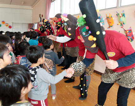 衣装作りに関わったPTA副会長の新屋敏子さん(38)は「お父さんたちの名演技で100点満点」。年長組の宮元花夏ちゃん(6)は「先生のお話をちゃんと聞くよ」と鬼と約束の握手を交わしていた。