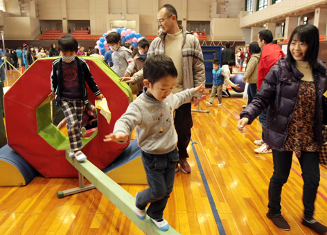 各園の父親クラブが中心となり、平均台やトランポリンなどを組み合わせたアスレチックコース、巨大なボールでピンを倒すボーリングなど8つのブースで子どもたちを迎えた。
