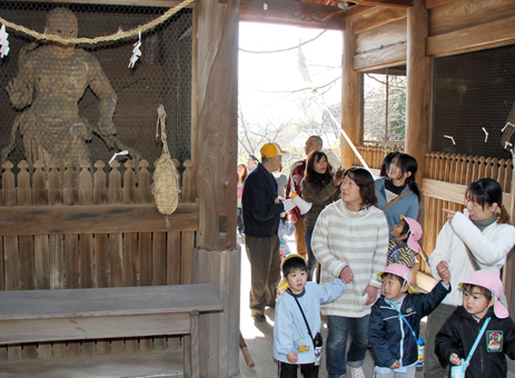 「さこし船岡を良くする会」の案内で、“能楽の祖”秦河勝をまつる大避神社、海岸整備や工場誘致の恩恵をもたらした山崎善吾・旧坂越村長の像などを見学。南北朝時代の忠臣、児島高徳を主人公に同会が制作した紙芝居「たかのりさん」(鳥井ひろお画)の上演もあり、「小さいころからよく勉強した」「悪い政治を止めさせた」などと子どもたちにもわかる言葉で功績を紹介した。