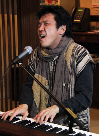 4日は相生学院高(尾池良一校長)の卒業式に招かれ、校歌などを伴奏。以前に尾池校長から奥野さんの話を聞いていた小川オーナーがコンサートを企画し、約35席ある店内は満席になった。電子ピアノに向かった奥野さんはやわらかな澄んだ声で弾き語った。
