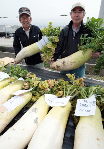 ジャンボ大根コンテストで優勝した馬江さん(右)と2位の前田さん