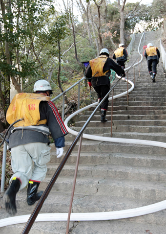 出火場所は2合目と3合目の間で標高80メートル付近。消防車8台のほか、水のうを背負って局地消火に当たるジェットシューター部隊も出動した。