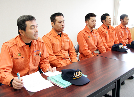 一次隊は地震発生当日の11日午後9時半ごろ、ポンプ車で赤穂を出発した。長野、福島を経由して13日に宮城県入り。15日夕方に二次隊に引き継ぐまで兵庫県隊の一員として、同県南部の山元町を中心に生存者の捜索活動にあたった。
