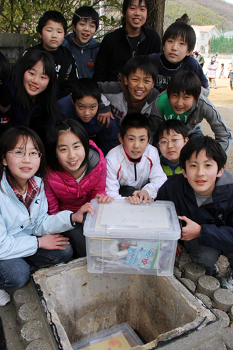 昨年10月に昭和63年度卒業生がタイムカプセルを取り出して空いていたコンクリート製の地下穴を再利用。寄せ書きした模造紙、保護者から我が子へのメッセージなどを個別にナイロン袋で包み、クラス単位に衣装ケースへ入れて格納した。